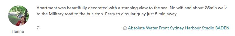 Apartment was beautifully decorated with a stunning view to the sea. No wifi and about 25min walk to the Military road to the bus stop. Ferry to circular quay just 5 min away.