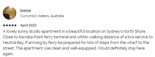 A lovely sunny studio apartment in a beautiful location on Sydney's North Shore. Close to Karraba Point ferry terminal and within walking distance of a bus service to Neutral Bay. If arriving by ferry be prepared for lots of steps from the wharf to the street. The apartment was clean and well-equipped. Would definitely stay here again.