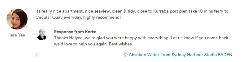 We book an apartment in Sydney through Apartment Service at least 3 times per year, and have been doing so for about 5 years. We just love the apartment we rent, and we just keep on coming back! We have always found the team at Apartment Service to be very professional, super responsive, and really helpful with any requests or assistance we needed.
