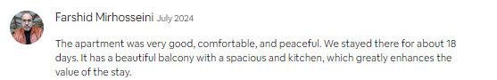 The apartment was very good, comfortable, and peaceful. We stayed there for about 18 days. It has a beautiful balcony with a spacious and kitchen, which greatly enhances the value of the stay.