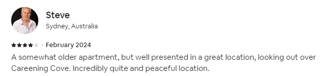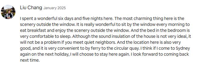 I spent a wonderful six days and five nights here. The most charming thing here is the scenery outside the window. It is really wonderful to sit by the window every morning to eat breakfast and enjoy the scenery outside the window. And the bed in the bedroom is very comfortable to sleep. Although the sound insulation of the house is not very ideal, it will not be a problem if you meet quiet neighbors. And the location here is also very good, and it is very convenient to by ferry to the circular quay. I think if I come to Sydney again on the next holiday, I will choose to stay here again. I look forward to coming back next time.