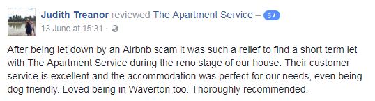 After being let down by an Airbnb scam it was such a relief to find a short term let with The Apartment Service during the reno stage of our house. Their customer service is excellent and the accommodation was perfect for our needs, even being dog friendly. Loved being in Waverton too. Thoroughly recommended.