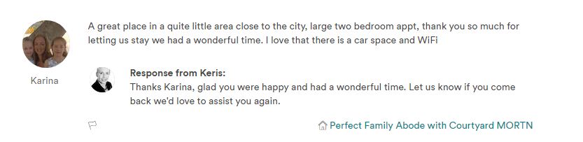 A great place in a quite little area close to the city, large two bedroom appt, thank you so much for letting us stay we had a wonderful time. I love that there is a car space and WiFi
