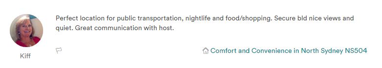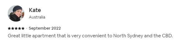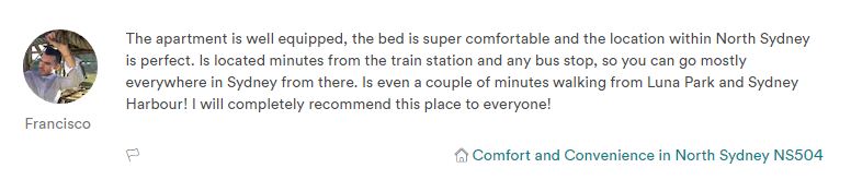 The apartment is well equipped, the bed is super comfortable and the location within North Sydney is perfect. Is located minutes from the train station and any bus stop, so you can go mostly everywhere in Sydney from there. Is even a couple of minutes walking from Luna Park and Sydney Harbour! I will completely recommend this place to everyone!