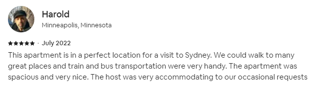 This apartment is in a perfect location for a visit to Sydney. We could walk to many great places and train and bus transportation were very handy. The apartment was spacious and very nice. The host was very accommodating to our occasional requests