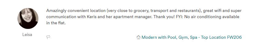 Shiran is very nice and helpful. Her apartment may not look very nice if you look for high quality living. However the location and swimming pool is awesome. When I have issue to move to next space, and keep on extending, Shiran very helpful to give me the flexibility. Thanks a lot! And a quick note, she just renew a sofa and tv stand, so much more better!
