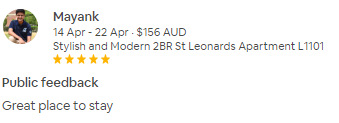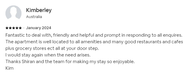 Fantastic to deal with, friendly and helpful and prompt in responding to all enquires. The apartment is well located to all amenities and many good restaurants and cafes plus grocery stores ect all at your door step.