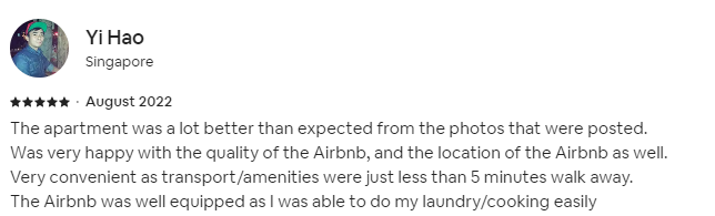 The apartment was a lot better than expected from the photos that were posted. Was very happy with the quality of the Airbnb, and the location of the Airbnb as well. Very convenient as transport/amenities were just less than 5 minutes walk away.