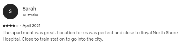 The apartment was great. Location for us was perfect and close to Royal North Shore Hospital. Close to train station to go into the city.