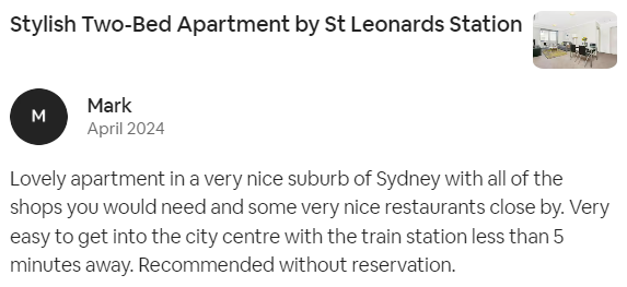 Lovely apartment in a very nice suburb of Sydney with all of the shops you would need and some very nice restaurants close by. Very easy to get into the city centre with the train station less than 5 minutes away. Recommended without reservation.