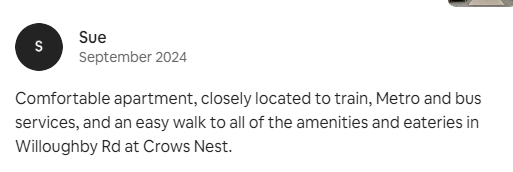 Comfortable apartment, closely located to train, Metro and bus services, and an easy walk to all of the amenities and eateries in Willoughby Rd at Crows Nest.