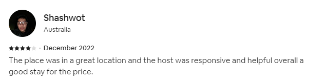 The place was in a great location and the host was responsive and helpful overall a good stay for the price.