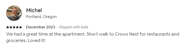 We had a great time at the apartment. Short walk to Crows Nest for restaurants and groceries. Loved it!