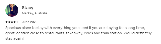 Spacious place to stay with everything you need if you are staying for a long time, great location close to restaurants, takeaway, coles and train station. Would definitely stay again!