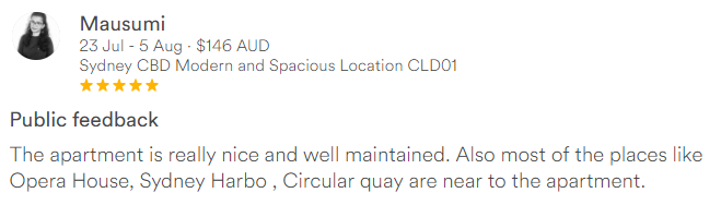 The apartment is really nice and well maintained. Also most of the places like Opera House, Sydney Harbo , Circular quay are near to the apartment.