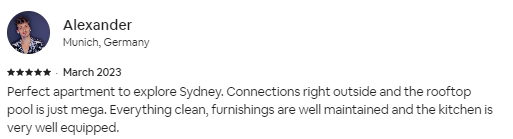 Perfect apartment to explore Sydney. Connections right outside and the rooftop pool is just mega. Everything clean, furnishings are well maintained and the kitchen is very well equipped.