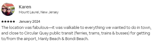 The location was fabulous—it was walkable to everything we wanted to do in town, and close to Circular Quay public transit (ferries, trams, trains & busses) for getting to/from the airport, Manly Beach & Bondi Beach.