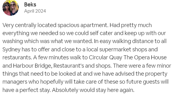 Very centrally located spacious apartment. Had pretty much everything we needed so we could self cater and keep up with our washing which was what we wanted. In easy walking distance to all Sydney has to offer and close to a local supermarket shops and restaurants. A few minutes walk to Circular Quay The Opera House and Harbour Bridge, Restaurant's and shops. There were a few minor things that need to be looked at and we have advised the property managers who hopefully will take care of these so future guests will have a perfect stay. Absolutely would stay here again.