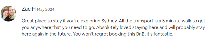 Great place to stay if you're exploring Sydney. All the transport is a 5 minute walk to get you anywhere that you need to go. Absolutely loved staying here and will probably stay here again in the future. You won't regret booking this BnB, it's fantastic.