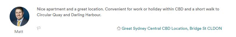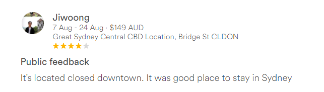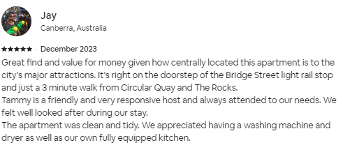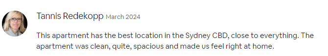 Great customer service all around there when I needed her. The apartment was nice and cozy felt like a little home away from home. Quiet but also around a lot of things to do. Whether it’s to grab a bite, drink, go shopping or just sightseeing. High recommend!! And you really can’t beat the price. If/when I go back to Sydney I would definitely stay here again!! Very professional and reliable if you ever have a question. Definitely a 5 star stay for me.