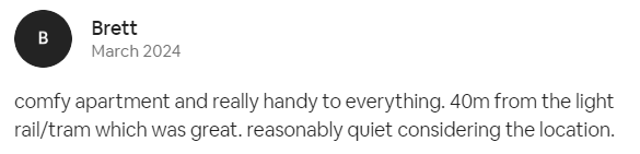 Comfy apartment and really handy to everything. 40m from the light rail/tram which was great. reasonably quiet considering the location.