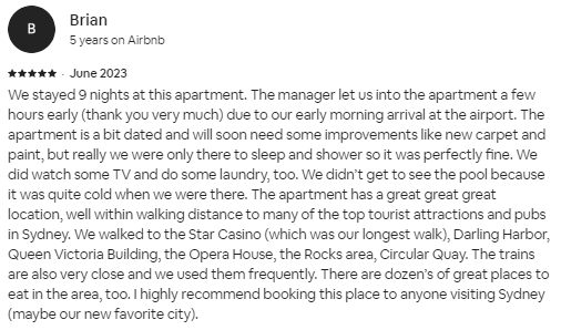 We stayed 9 nights at this apartment. The manager let us into the apartment a few hours early (thank you very much) due to our early morning arrival at the airport. The apartment is a bit dated and will soon need some improvements like new carpet and paint, but really we were only there to sleep and shower so it was perfectly fine. We did watch some TV and do some laundry, too. We didn’t get to see the pool because it was quite cold when we were there. The apartment has a great great great location, well within walking distance to many of the top tourist attractions and pubs in Sydney. We walked to the Star Casino (which was our longest walk), Darling Harbor, Queen Victoria Building, the Opera House, the Rocks area, Circular Quay. The trains are also very close and we used them frequently. There are dozen’s of great places to eat in the area, too. I highly recommend booking this place to anyone visiting Sydney (maybe our new favorite city).
