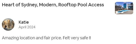 The location of this apartment is great! Very near Circular Quay and also Wynyard Station for the public transit trains. Walkable to many sites and plenty of restaurants and grocery stores nearby. The apartment was a great size for the two of us for a week. Having the laundry facility was helpful, too. We didn't get to swim in the rooftop pool due to the weather, but would have liked that if it had been hot outside. Not fancy, but clean and spacious. I would definitively go back.