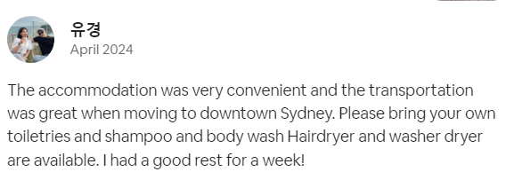 The accommodation was very convenient and the transportation was great when moving to downtown Sydney. Please bring your own toiletries and shampoo and body wash Hairdryer and washer dryer are available. I had a good rest for a week!
