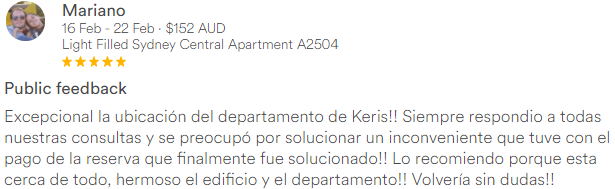 Excepcional la ubicación del departamento de Keris!! Siempre respondio a todas nuestras consultas y se preocupó por solucionar un inconveniente que tuve con el pago de la reserva que finalmente fue solucionado!! Lo recomiendo porque esta cerca de todo, hermoso el edificio y el departamento!! Volvería sin dudas!!