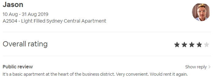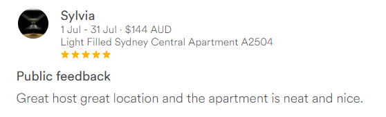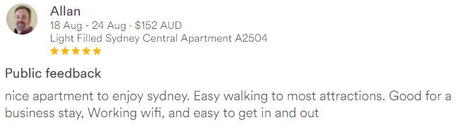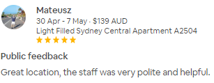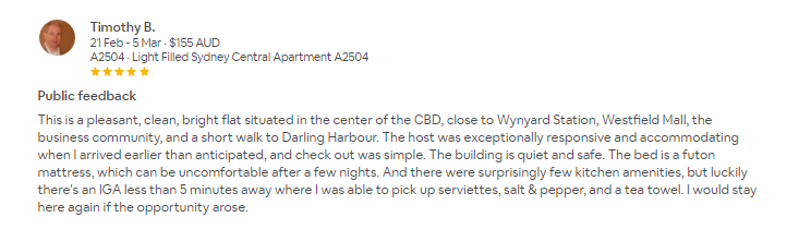 This is a pleasant, clean, bright flat situated in the center of the CBD, close to Wynyard Station, Westfield Mall, the business community, and a short walk to Darling Harbour. The host was exceptionally responsive and accommodating when I arrived earlier than anticipated, and check out was simple. The building is quiet and safe. The bed is a futon mattress, which can be uncomfortable after a few nights. And there were surprisingly few kitchen amenities, but luckily there's an IGA less than 5 minutes away where I was able to pick up serviettes, salt & pepper, and a tea towel. I would stay here again if the opportunity arose.