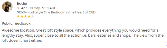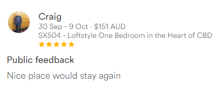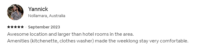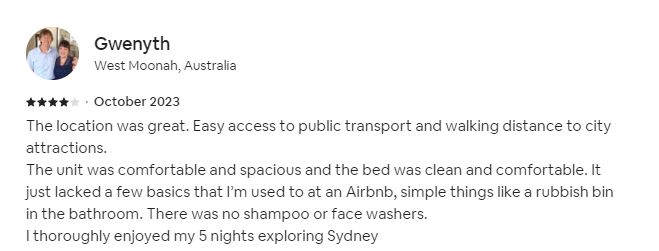 The unit was comfortable and spacious and the bed was clean and comfortable. It just lacked a few basics that I’m used to at an Airbnb, simple things like a rubbish bin in the bathroom. There was no shampoo or face washers.
