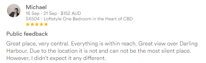 Great place, very central. Everything is within reach. Great view over Darling Harbour. Due to the location it is not and can not be the most silent place. However, I didn't expect it any different.