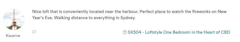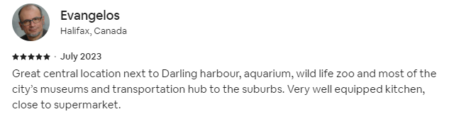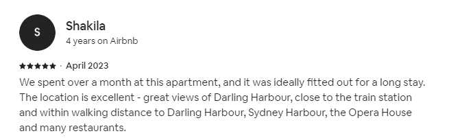 I stayed for 5 weeks and loved my stay here. The location is excellent, just a few minutes walk from Darling Harbour. The apartment was clean, well equipped, and also has a nice view of Darling Harbour and the Saturday fireworks. -would stay here again.