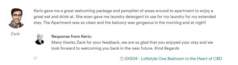 Keris gave me a great welcoming package and pamphlet of areas around to apartment to enjoy a great eat and drink at. She even gave me laundry detergent to use for my laundry for my extended stay. The Apartment was so clean and the balcony was gorgeous in the morning and at night!