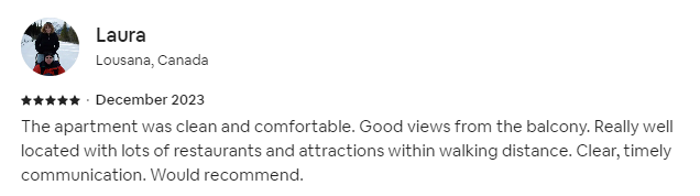 The apartment was clean and comfortable. Good views from the balcony. Really well located with lots of restaurants and attractions within walking distance. Clear, timely communication. Would recommend.