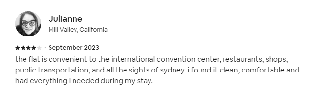 The flat is convenient to the international convention center, restaurants, shops, public transportation, and all the sights of sydney. i found it clean, comfortable and had everything i needed during my stay.