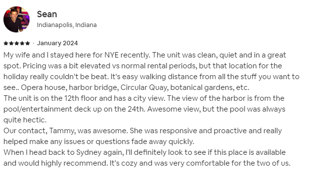 My wife and I stayed here for NYE recently. The unit was clean, quiet and in a great spot. Pricing was a bit elevated vs normal rental periods, but that location for the holiday really couldn't be beat. It's easy walking distance from all the stuff you want to see.. Opera house, harbor bridge, Circular Quay, botanical gardens, etc.
