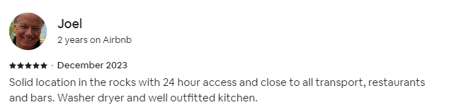 Solid location in the rocks with 24 hour access and close to all transport, restaurants and bars. Washer dryer and well outfitted kitchen.