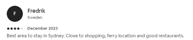 Best area to stay in Sydney. Close to shopping, ferry location and good restaurants.