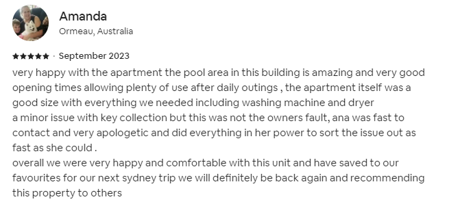 overall we were very happy and comfortable with this unit and have saved to our favourites for our next sydney trip we will definitely be back again and recommending this property to others