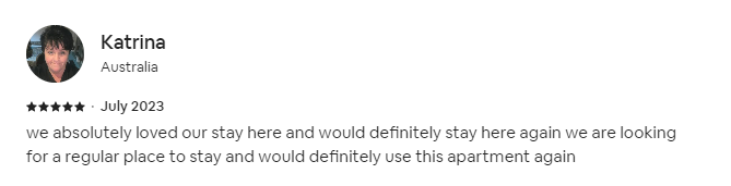 We absolutely loved our stay here and would definitely stay here again we are looking for a regular place to stay and would definitely use this apartment again