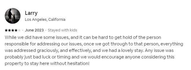 While we did have some issues, and it can be hard to get hold of the person responsible for addressing our issues, once we got through to that person, everything was addressed graciously, and effectively, and we had a lovely stay. Any issue was probably just bad luck or timing and we would encourage anyone considering this property to stay here without hesitation!