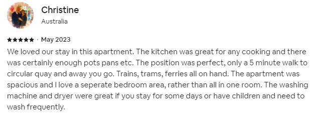 We loved our stay in this apartment. The kitchen was great for any cooking and there was certainly enough pots pans etc. The position was perfect, only a 5 minute walk to circular quay and away you go. Trains, trams, ferries all on hand. The apartment was spacious and I love a seperate bedroom area, rather than all in one room. The washing machine and dryer were great if you stay for some days or have children and need to wash frequently.