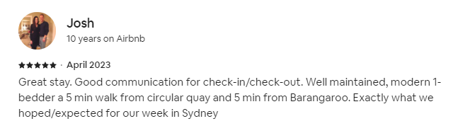 Great stay. Good communication for check-in/check-out. Well maintained, modern 1-bedder a 5 min walk from circular quay and 5 min from Barangaroo. Exactly what we hoped/expected for our week in Sydney