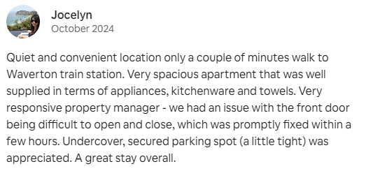 Quiet and convenient location only a couple of minutes walk to Waverton train station. Very spacious apartment that was well supplied in terms of appliances, kitchenware and towels. Very responsive property manager - we had an issue with the front door being difficult to open and close, which was promptly fixed within a few hours. Undercover, secured parking spot (a little tight) was appreciated. A great stay overall.