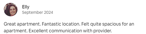 Great apartment. Fantastic location. Felt quite spacious for an apartment. Excellent communication with provider.