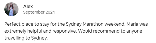 Perfect place to stay for the Sydney Marathon weekend. Maria was extremely helpful and responsive. Would recommend to anyone travelling to Sydney.