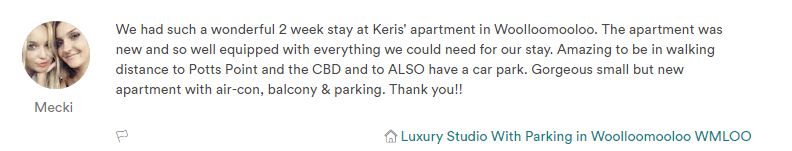 We had such a wonderful 2 week stay at Keris' apartment in Woolloomooloo. The apartment was new and so well equipped with everything we could need for our stay. Amazing to be in walking distance to Potts Point and the CBD and to ALSO have a car park. Gorgeous small but new apartment with air-con, balcony & parking. Thank you!!
